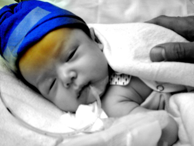 A few weeks in, he started to have trouble keeping his milky stomach fluids down, which led to precipitous slowing of weight gain. Although the urgency gained on us quickly, it seemed like an eternity. He’d swallow his portion, and the way I recall it, we tried to keep him upright to convince the milk to stay down– until we finally learned that the linkage between stomach and small intestine was narrowing so that the frothy, milky stuff had nowhere to go but up and out. It dribbles over the chin at first, a chalky waterfall; but then it starts to gain eruptive power and travels farther, like a practiced shot-putter improving his trajectory. It’s alarming. Good sleep became much harder for him to get, and so did nutrition.