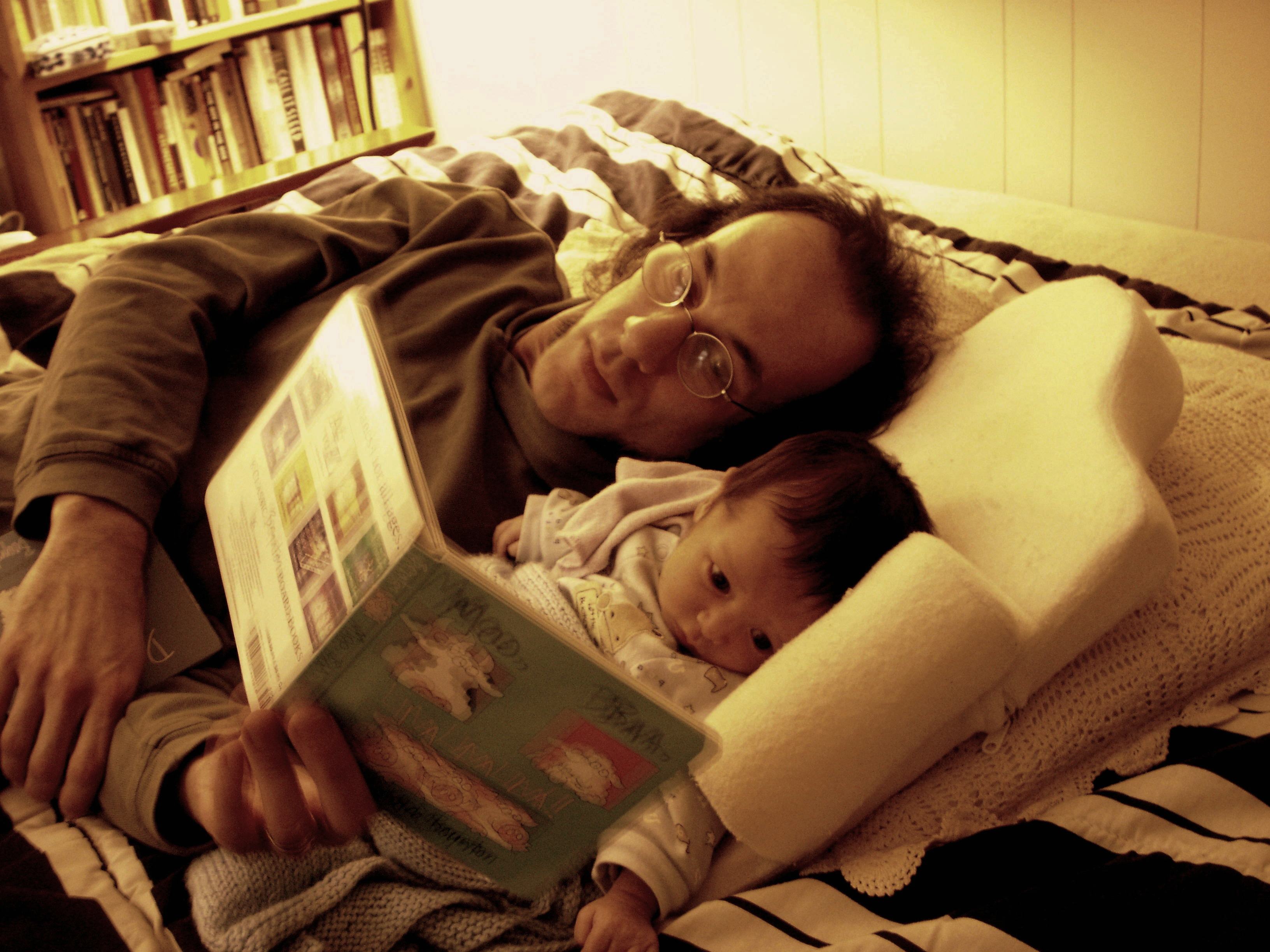 Among my more indelible memories of this phase is of lying with him in bed what may have been only one or at most two weeks earlier, trying to soothe him into a nap, his ball-sized head nested between my chest and arm, my hand wrapped around his bookbag body, as he drifted slowly, slowly to sleep. Just before he passed into unconsciousness, the last milk he’d swallowed squirted out of his soft, coin purse mouth and landed squarely in my ear. I couldn’t hear, but I could feel the warm sticky stuff settling in. I didn’t dare move until he fell all the way to sleep and stayed that way a long while. I think I fell asleep there with him for a time, pukey ear and all. (All parents know that sensitivity about bodily fluids is among the first bits of squeamishness to go.) He felt like one of Harry Harlow’s rhesus monkeys, cradled by his terry cloth mother-doll, which was me. He breathed softly in sleep. The warmth and binding love eased through my chest, my arm, up my cheeks, into my face. It invaded my neurocircuitry where it would stay, until now.